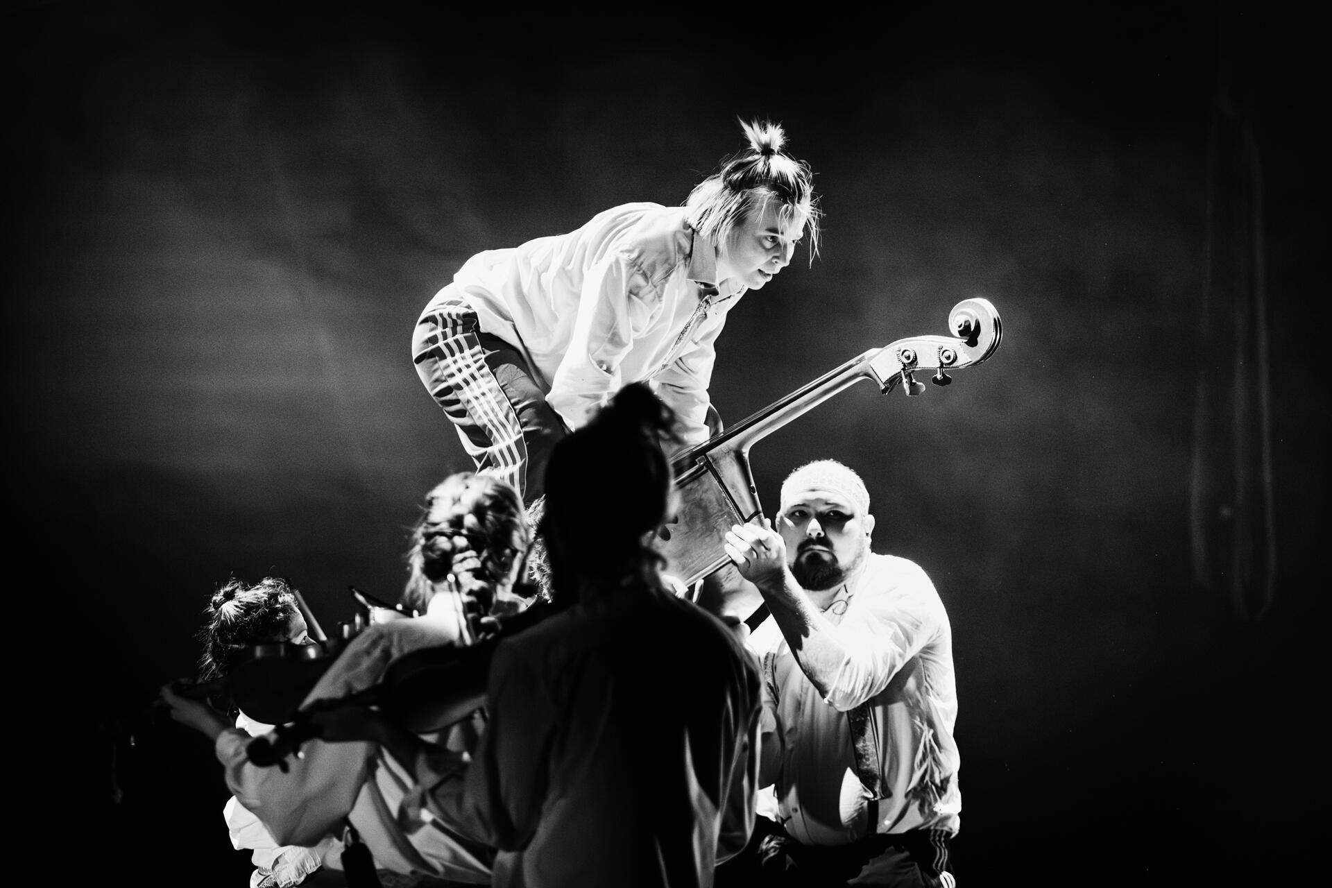 tribute. It is a bold reinvention.8 artists on stage with violins, trapeze, ropes, hair-hanging, synthesizers, slängpolska, acrobatics,